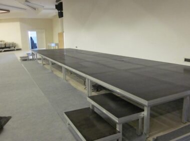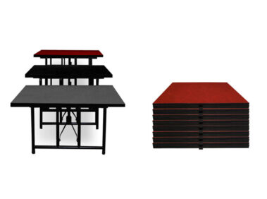 يتم تجميع إطار من الألومنيوم والخشب على شكل ألواح خشبية جنبًا إلى جنب لإنشاء حجم المسرح المطلوب. بفضل أقدام الألمنيوم من ارتفاعات مختلفة يتم الحصول على الارتفاع المناسب.